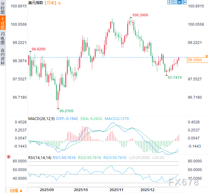 周一(1月5日)亚市时段,美元指数于98.55附近震荡。