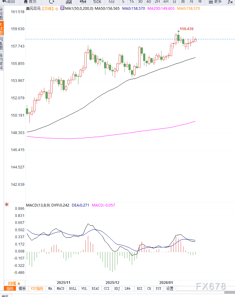 从技术面来看,美元兑日元短线走势呈现震荡偏强结构。汇价在此前回落后稳守关键支撑区域,并重新回到158关口上方,显示下方买盘仍具一定韧性。