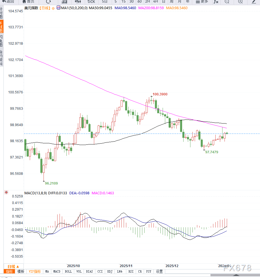 同时,MACD指标仍运行在零轴下方,快慢线维持弱势结构,暗示美元指数短期内仍以震荡偏弱为主。若后续跌破98.00一线支撑,可能进一步打开下行空间;反之,若经济数据意外向好,指数需重新站稳99.00上方,才能改善整体技术形态。